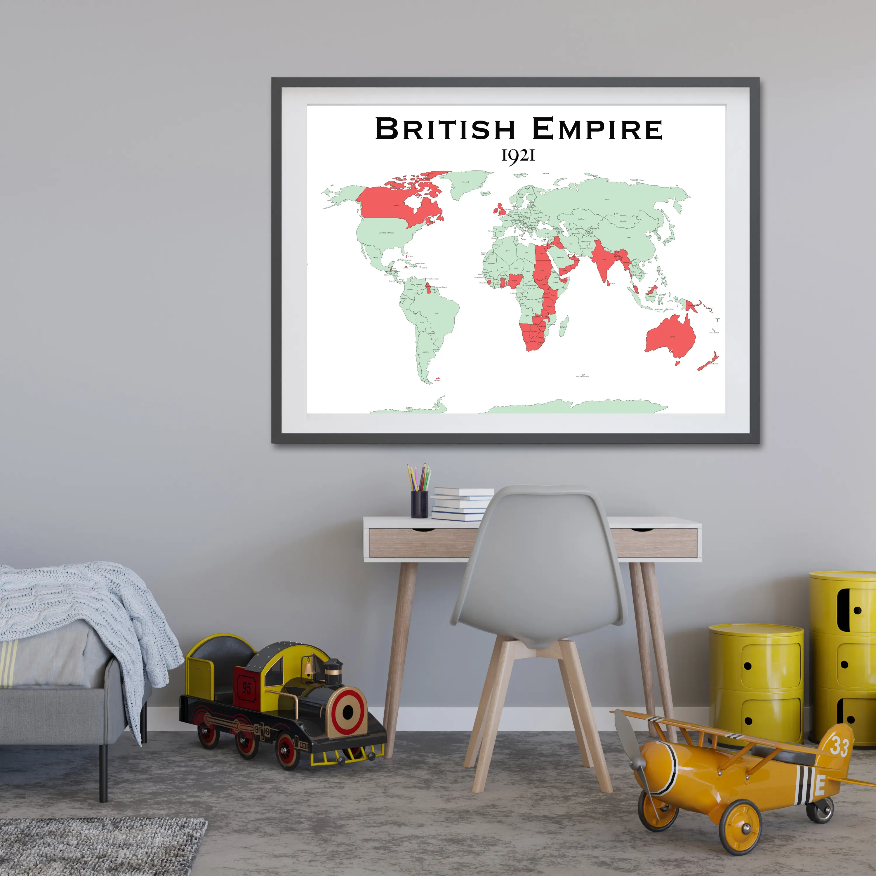 The British Empire Map is a detailed historical world map showing the extent of the British Empire in 1921. Ideal for education, study spaces and period interiors.