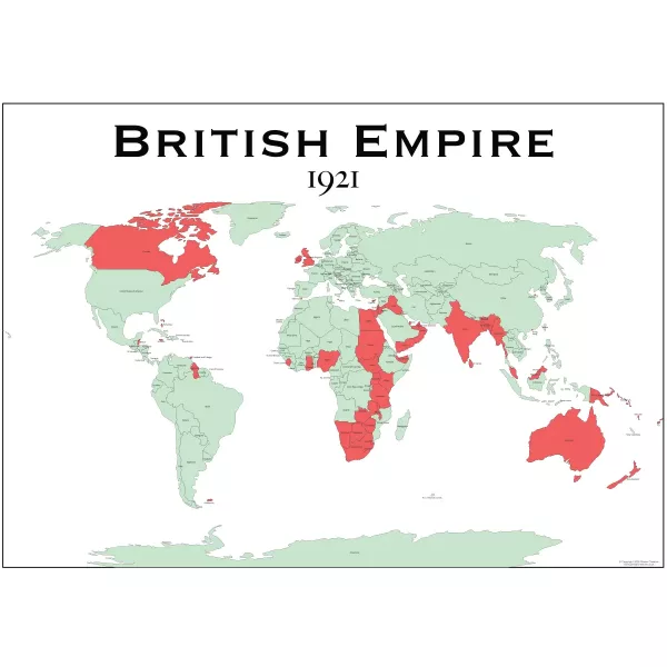 The map covers every continent and illustrates dominions, colonies and protectorates as they stood in 1921. From Canada and Australia to India, Africa and the Caribbean, it provides valuable historical context for students, educators and anyone interested in world history, geopolitics or colonial studies.