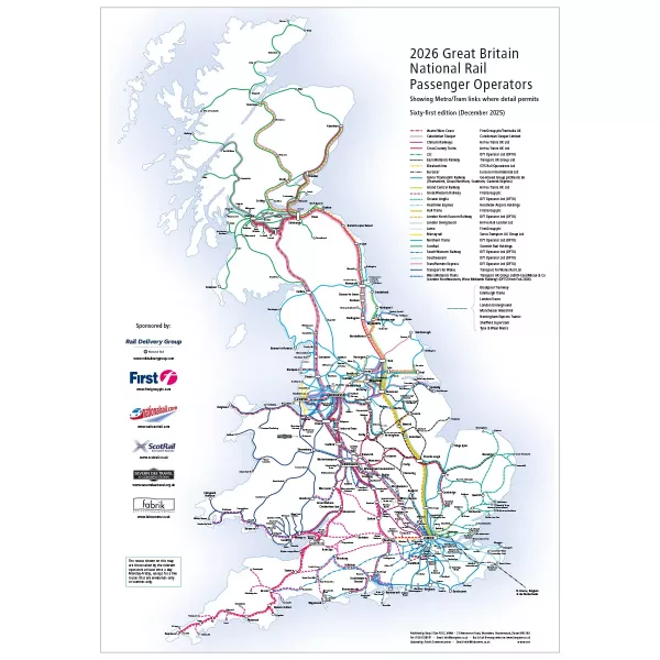 The 2026 Great Britain National Rail Passenger Operators Map (61st Edition) provides a clear and comprehensive overview of all National Rail passenger services across England, Scotland and Wales. Updated for November 2025, this UK Train Network Map includes: